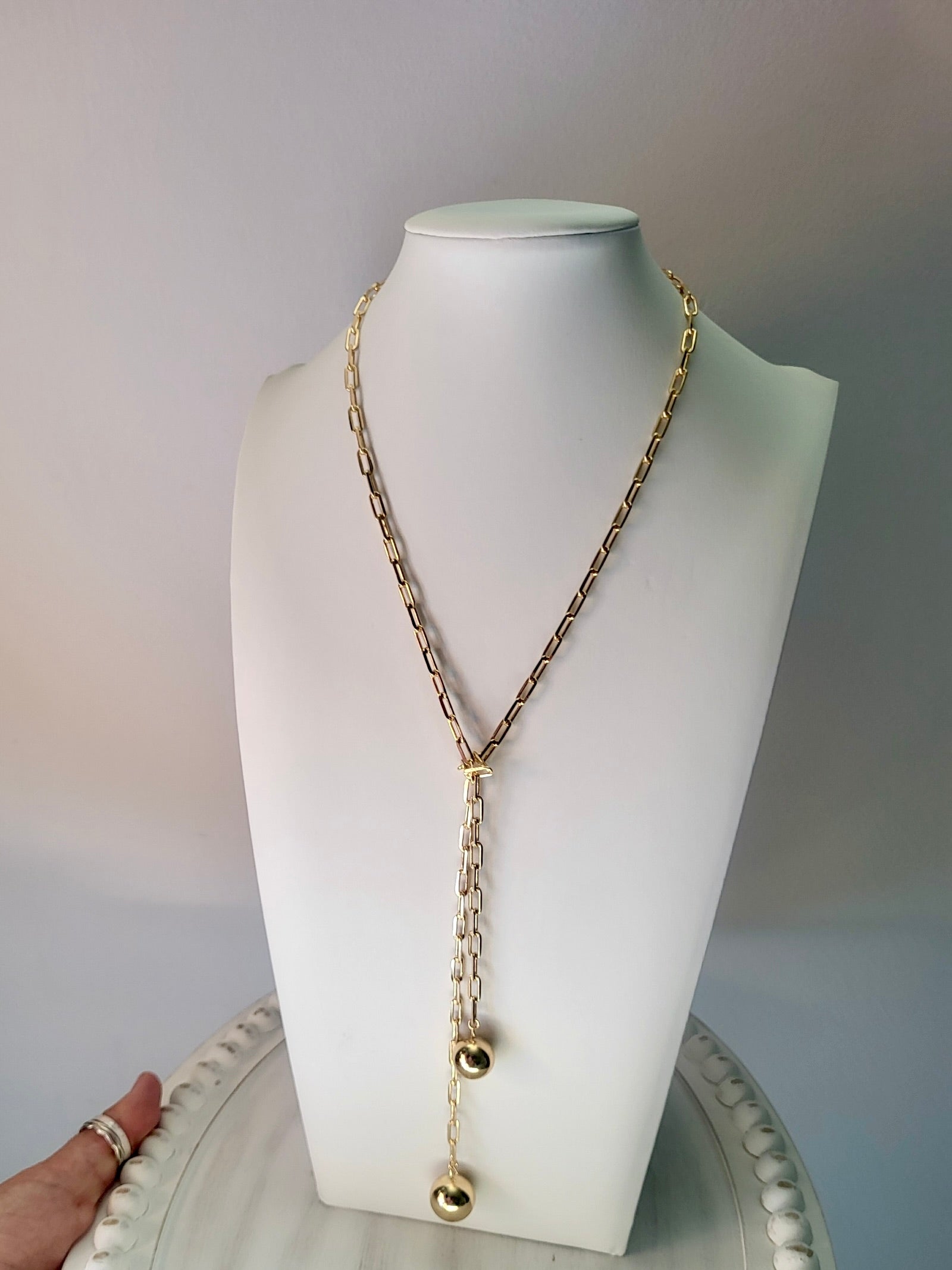 Make a statement with this gold filled paper clip lariat necklace. Featuring a sleek paper clip chain and polished gold ball endings, this piece adds modern elegance to any look. Perfect for layering or wearing solo, this lariat effortlessly transitions from day to night. Crafted with high-quality gold filled materials for lasting shine and durability.